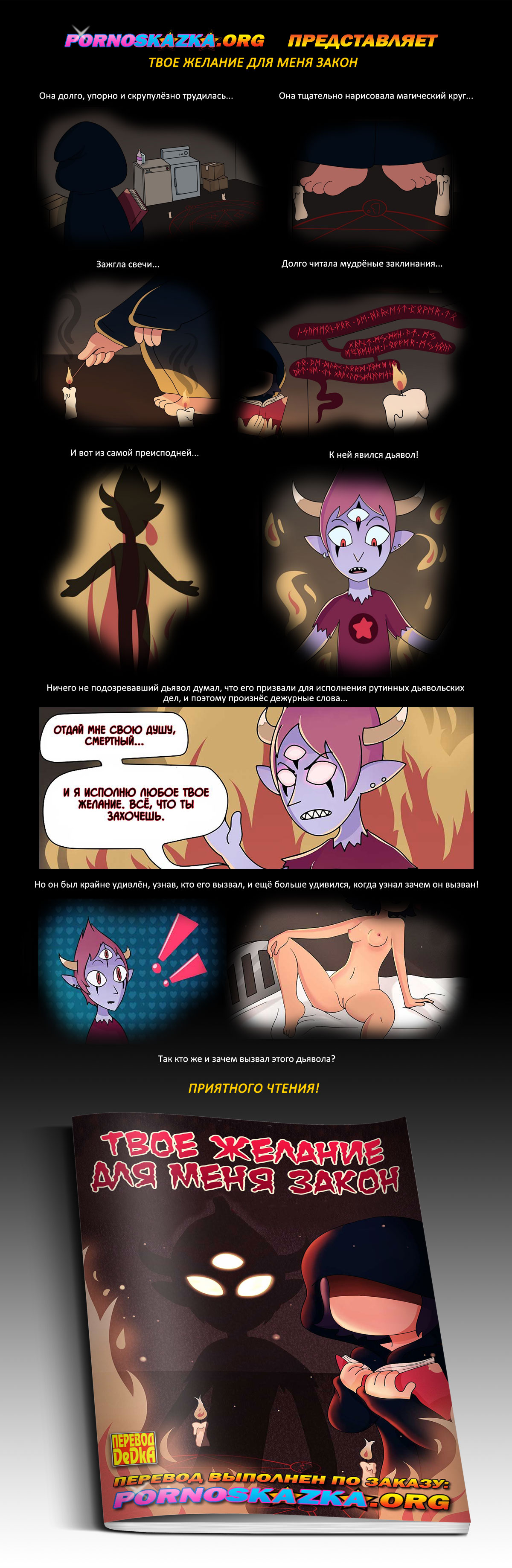 Девушка долго, упорно и скрупулёзно трудилась, она тщательно нарисовала магический круг, зажгла свечи, долго читала мудрёные заклинания… И вот из самой преисподней К ней явился дьявол! Ничего не подозревавший дьявол думал, что его призвали для исполнения рутинных дьявольских дел, и поэтому произнёс дежурные слова: «Отдай мне свою душу, смертный, и я исполню любое твое желание.» Но увидев голую девушку, он был крайне удивлён и ещё больше удивился, когда узнал зачем он был вызван!